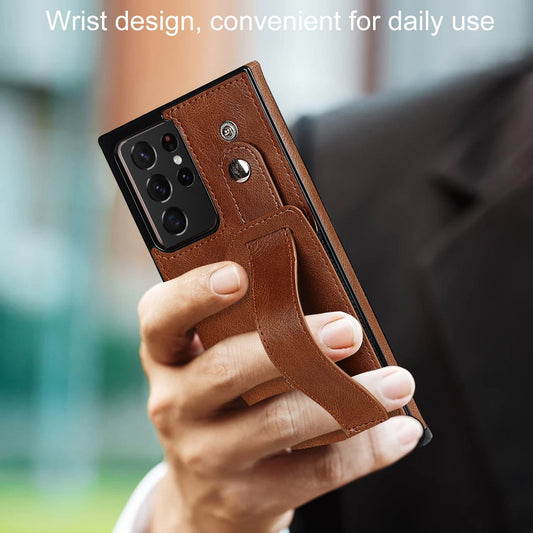 [FREE SHIPPING] BUSINESS CARD SLOT ADJUSTABLE WRIST STRAP CREDIT CARD SLOT SLIM SHOCKPROOF LEATHER CASE FOR SAMSUNG S21 ULTRA