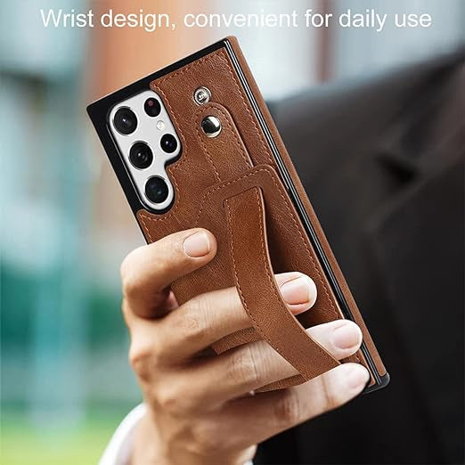 [FREE SHIPPING] BUSINESS CARD SLOT ADJUSTABLE WRIST STRAP CREDIT CARD SLOT SLIM SHOCKPROOF LEATHER CASE FOR SAMSUNG S22 ULTRA