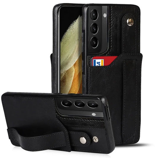 [FREE SHIPPING] BUSINESS CARD SLOT ADJUSTABLE WRIST STRAP CREDIT CARD SLOT SLIM SHOCKPROOF LEATHER CASE FOR SAMSUNG S21 Plus
