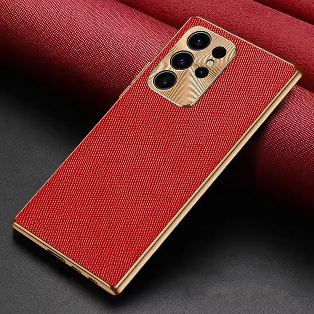 Elevate your device with the Gold Edge Leather Case, featuring a premium textured fabric back, gold-finished edges, and a precision camera cutout. Designed for elegance and durability, it offers a sleek grip and high-end protection.