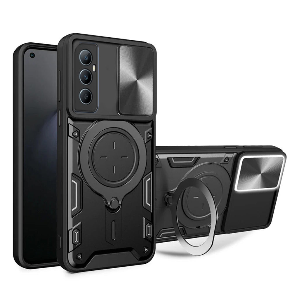 - The RMG Case is the epitome of protection fused with functionality. Crafted with precision, this case seamlessly envelopes your device in a robust shield without compromising on style or usability.Its design features a fusion of materials, combining a durable metal ring with a protective armor hybrid, ensuring maximum safeguarding against daily wear, accidental drops, and impacts. The amalgamation of sturdy materials provides a reliable shield for your device's camera, keeping it safe from scratches, bumps, and cracks.What sets this case apart is its innovative rotating holder at the back, offering unparalleled convenience. Whether you're watching videos, browsing, or taking photos, this rotating holder provides a comfortable grip and transforms into a handy stand for hands-free viewing in both portrait and landscape orientations.The precise cutouts guarantee easy access to ports, buttons, and the camera, allowing for seamless functionality without compromising on protection. Its slim profile ensures a snug fit, maintaining the sleek aesthetics of your mobile while adding an extra layer of defense.With the RMG Case, enjoy the perfect balance of style, durability, and functionality, ensuring your device remains safeguarded while complementing your lifestyle.