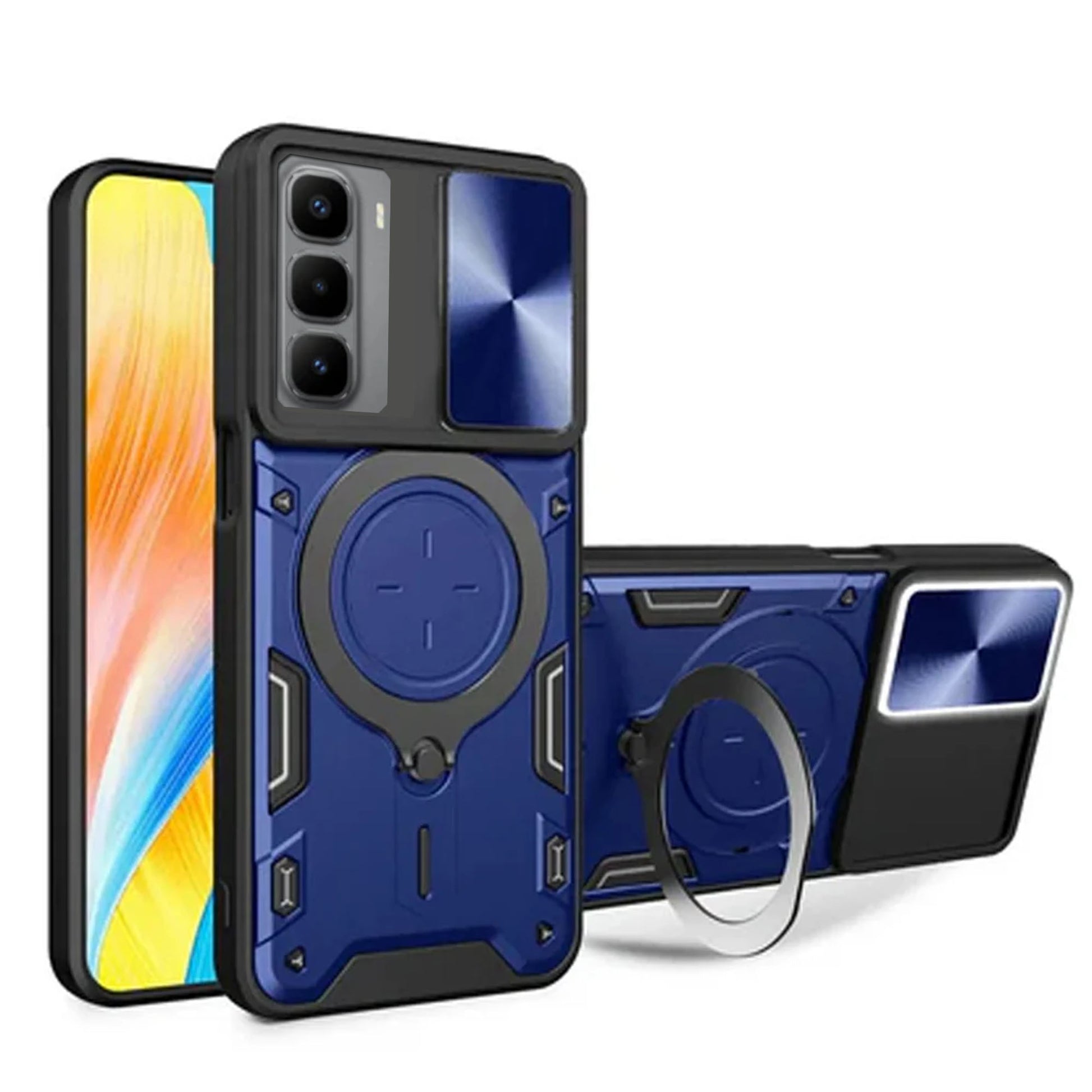 - The RMG Case is the epitome of protection fused with functionality. Crafted with precision, this case seamlessly envelopes your device in a robust shield without compromising on style or usability.Its design features a fusion of materials, combining a durable metal ring with a protective armor hybrid, ensuring maximum safeguarding against daily wear, accidental drops, and impacts. The amalgamation of sturdy materials provides a reliable shield for your device's camera, keeping it safe from scratches, bumps, and cracks.What sets this case apart is its innovative rotating holder at the back, offering unparalleled convenience. Whether you're watching videos, browsing, or taking photos, this rotating holder provides a comfortable grip and transforms into a handy stand for hands-free viewing in both portrait and landscape orientations.The precise cutouts guarantee easy access to ports, buttons, and the camera, allowing for seamless functionality without compromising on protection. Its slim profile ensures a snug fit, maintaining the sleek aesthetics of your mobile while adding an extra layer of defense.With the RMG Case, enjoy the perfect balance of style, durability, and functionality, ensuring your device remains safeguarded while complementing your lifestyle.